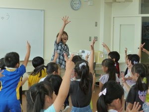 「ラジオ体操」や「もうじゅう狩りあそび」「じゃんけん列車」など、身体を使った遊びで一緒に大はしゃぎ。子どもたちも自己紹介してくれて、自然と心が通い合い、あっという間に45分が経ちました。