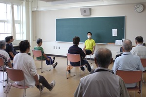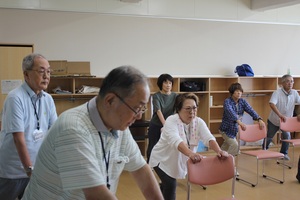 「椅子に座って行う高齢者向けのストレッチ、筋トレ、有酸素運動で、あまり負担のない軽い運動です」と説明があり、シニア生は安心した様子でした。