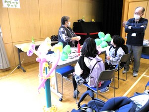 今回は、バルーンアート、ビーズブレスレット、ディンプルアート、キーホルダー、プラバンアート、ヘアゴム、キラキラ消臭剤、スライムや綿あめ作り、また、輪なげや金魚釣りといったゲームもあり盛りだくさんの内容となっています。いくつも体験する子もいて楽しそうにしていました。また地域の人が寄贈した衣類、食器類、小物雑貨などを無償で譲る「ゆずありコーナー」には大人にも人気でした。