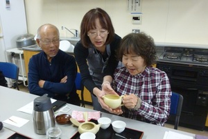 シニア生は二人一組になり、嬉野茶と八女茶の2種類を、それぞれポイントに沿って淹れ合い、用意していただいた和菓子と一緒に味わいました。