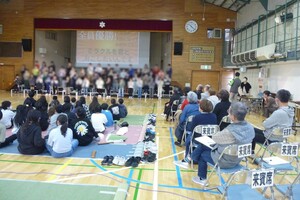 シニア生は体育館で観覧し、児童たちは、現在インフルエンザが流行しているため、各教室でリモート視聴する形式となりました。