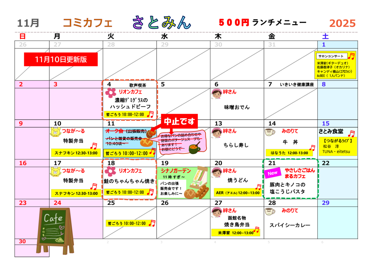 11月の500円ランチの予定(11月10日更新)です